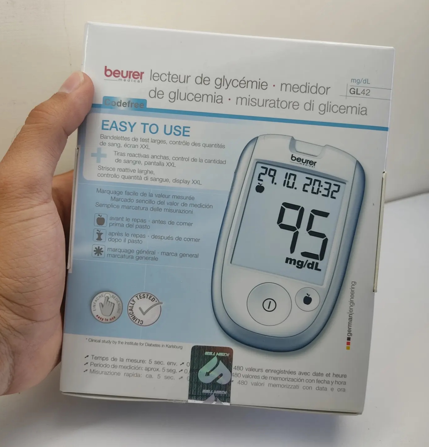 این دستگاه قابلیت نمایش نتیجه در کمتر از 5 ثانیه را دارد. دستگاه تست قندخون بیورر مدل GL42، بدون نیاز به کد گذاری می باشد و کار را برای مصرف کنندگان بسیار آسان نموده است. همچنین یکی دیگر از ویژگی های بارز اهمیت این محصول، 480 جایگاه حافظه قابل ثبت می باشد